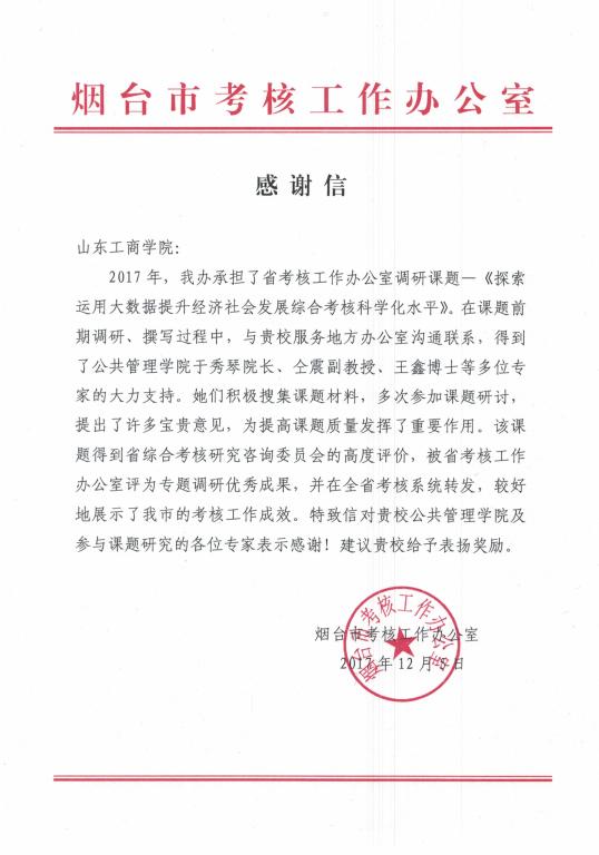 近日,烟台市考核工作办公室向我校发来感谢信,对我院于秀琴院长、仝震副教授、王鑫博士参与考核办课题调研工作给予充分肯定,并建议学校给予表扬奖励。