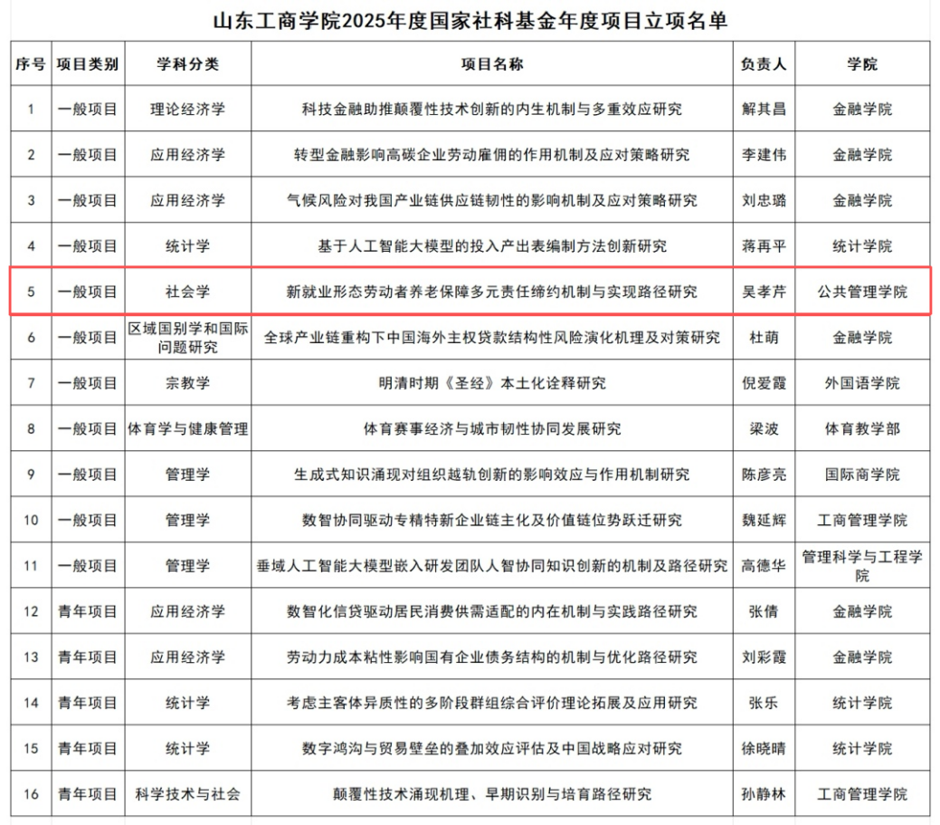 近日,全国哲学社会科学工作办公室公布2025年国家社科基金年度项目立项名单,学校共获批年度项目16项,整体成绩稳步提升。我院教师吴孝芹申报《新就业形态劳动者养老保障多元责任缔约机制与实现路径研究》项目成功获批2025年国家社科基金年度项目。
