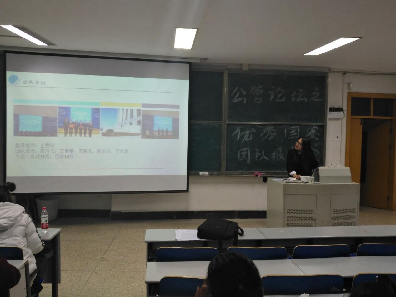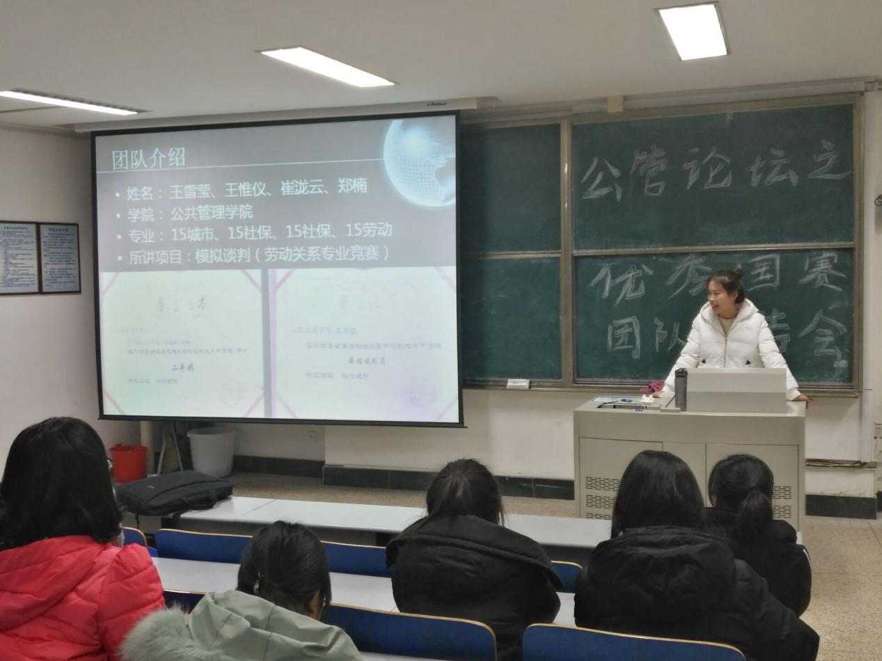 为了充分发挥优秀学生的榜样示范带头作用,培养团队意识和提高人际交往能力,更好的帮助同学树立创先争优的意识,实现自己的目标,公共管理学院于2017年11月26日晚上7点在第四教学楼214教室举办了公管论坛之优秀国赛团队报告会。参加本次活动的是大一大二学生。