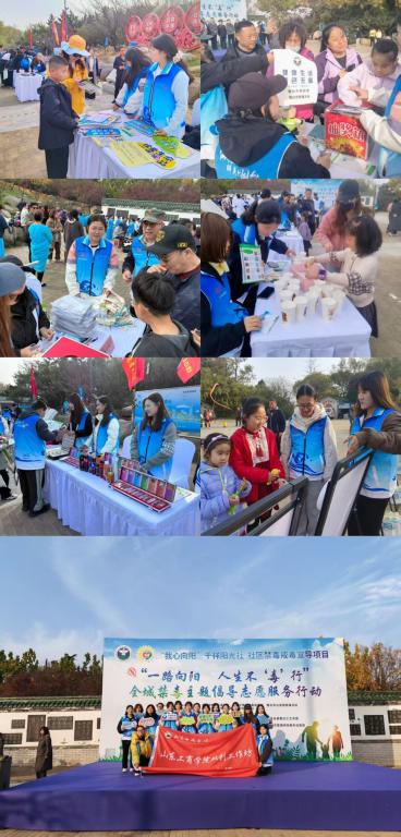 11月15日,我院青年志愿团在南山公园栖云阁广场参加由烟台市民政局及烟台市慈善总会举办、烟台市千祥公益发展中心承办的“一路向阳·人生不‘毒’行”全城禁毒倡议活动,以青春之姿为禁毒公益事业贡献力量。